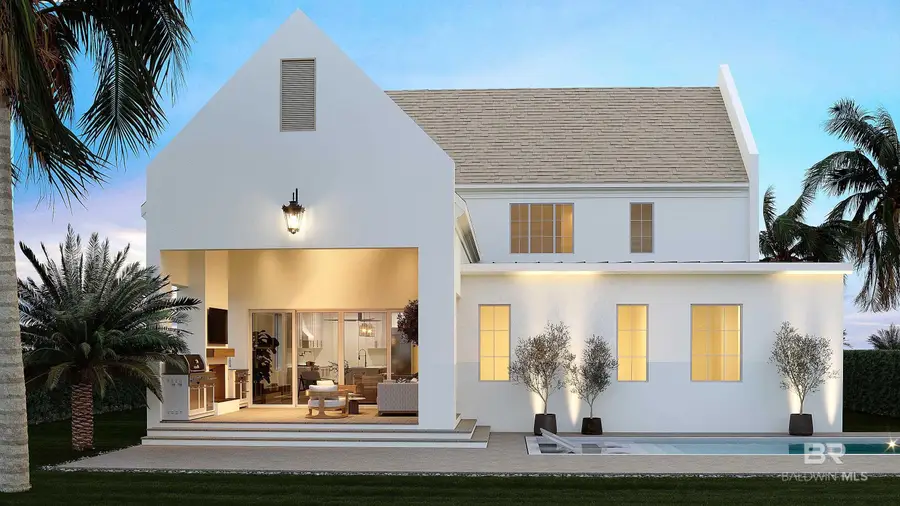 Welcome to coastal luxury reimagined! Tucked away in a private, gated bayfront community, this thoughtfully designed residence showcases clean coastal lines, luxury living, water views, and an open-concept layout for entertaining and serene everyday living. Inside, you'll find high-end finishes throughout, a spacious kitchen with custom cabinets and premium Thermador appliances, a luxurious primary suite on the ground floor, a laundry room on the main floor plus extra laundry hookups in two of the upstairs guest bedrooms, an additional living room/bonus space upstairs, engineered hardwood and tile flooring, 16’ coffered ceiling in the living room, custom closets, low maintenance turf landscaping, paver driveway, and so much more. The living room opens to the covered back porch that is setup for relaxation and entertaining with a gas grill and gas fireplace. The 10x20 saltwater pool is perfect for cooling off on those hot summer days. This home is built to last with ICF concrete construction, and it is Fortified Gold. X Zone (flood insurance not required)! Moondance is a new charming waterfront community on the beautiful shores of Perdido Bay in East Orange Beach. Filled with natural beauty, this unique community offers a peaceful setting, impressive heritage oak trees, a large common area pier, and beautiful sunrises - just minutes from white sandy beaches and so many great dining options. Home is under construction and projected to be complete in December of 2025. Virtual renderings are provided as examples. Builder reserves the right to make changes and substitutions. Buyer to verify all information during due diligence.