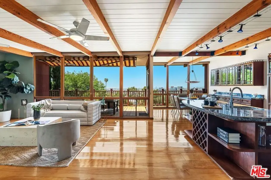 Franklin Hills Mid-Century Modern. Priced to Sell Rare Investor & Lifestyle Opportunity! A true Franklin Hills gem offering architectural style, panoramic views, and built-in income potential at the lowest price per sq. ft. in the neighborhood. This multi-level mid-century residence blends timeless design with modern functionality, featuring 2,387 sq. ft. plus bonus space and panoramic views from nearly every level especially the main terrace and primary suite. Inside, exposed beam ceilings, hardwood floors, and seamless indoor-outdoor flow capture the essence of the Southern California lifestyle. The chef's kitchen is fully upgraded with a Sub-Zero refrigerator, Viking appliances, dual ovens/microwaves, wine cooler, and Brazilian granite counters. The main level includes two bedrooms and two full baths. The lower level features a private one-bedroom suite with full bath, living room, separate entrance, and laundry room, ideal for guests, rental, or Airbnb. A bonus room below adds flexibility for a gym, office, or creative studio.Outdoors, enjoy expansive view decks, terraced gardens with fruit trees, a tranquil open cover patio, and renovated stairways, perfect for entertaining under the Los Feliz sky. Located within the Franklin Elementary district and moments from Los Feliz Village, Griffith Park, and the Observatory. A rare opportunity to own a reimagined Franklin Hills classic combining architectural beauty, income potential, and breathtaking views.